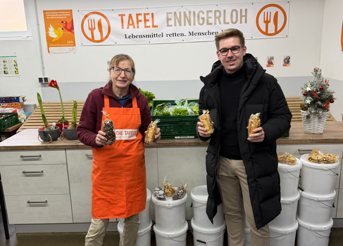 Die Übergabe der Plätzchen bei der Tafel Ennigerloh (Renate Koppenstein, Geschäftsführerin Tafel Ennigerloh; Joel Etienne Petereit, Auszubildender der Rottendorf Pharma